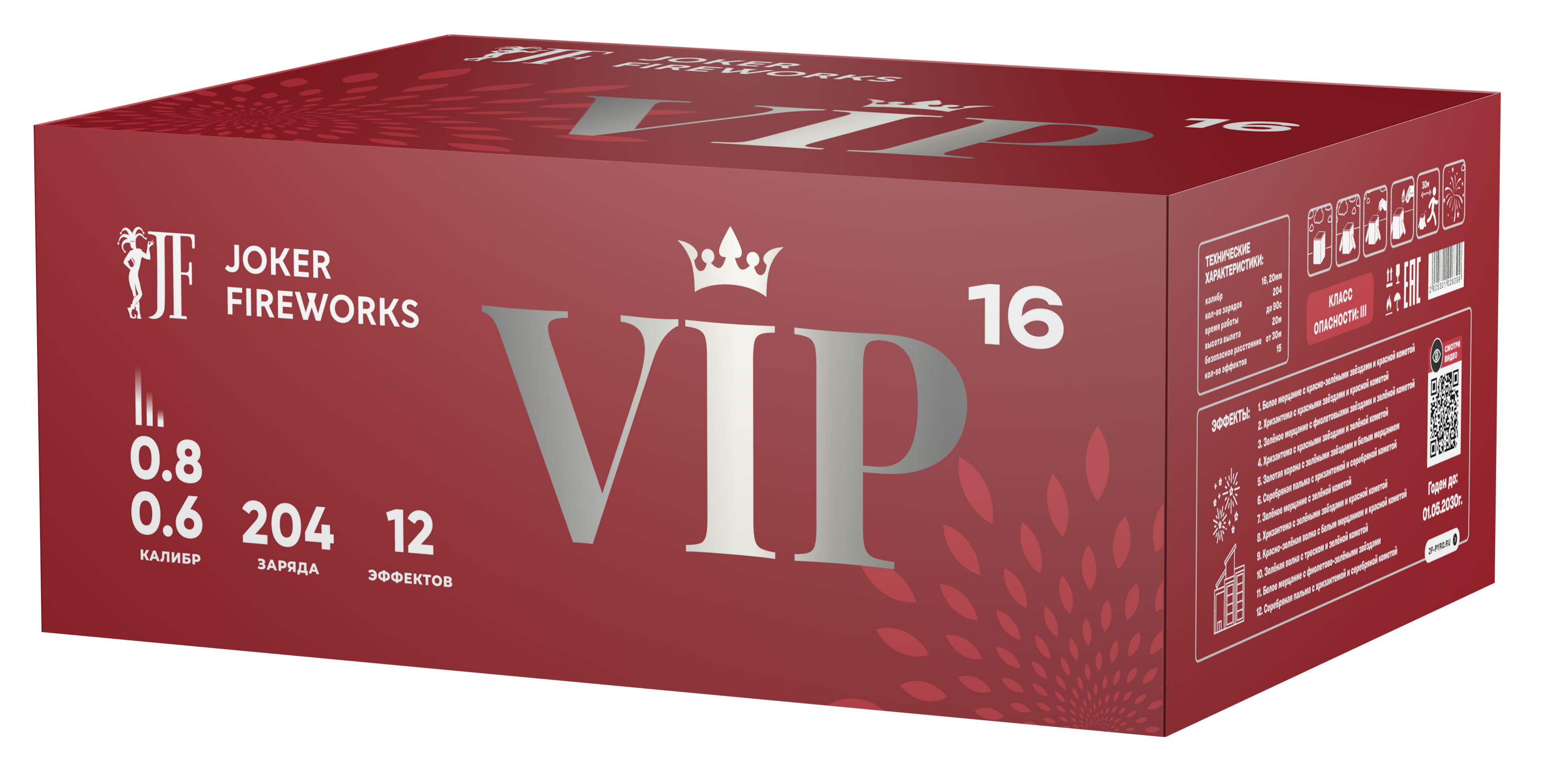 🎇✨ Откройте невероятные возможности праздничного фейерверка от бренда Joker Fireworks! 🌟 Салютная установка JF VIP16 – это незабываемое шоу из 204 ярких залпов калибра 0,6 и 0,8 дюйма ✨, взлетающих на высоту до 20 метров 🚀! Подарите себе и близким феерию эмоций благодаря длительности представления почти 90 секунд ⏳ и комбинации 12 потрясающих эффектов со свистом 🪣, треском 💥 и мерцанием 🤩! Создайте атмосферу настоящего праздника вместе с JF VIP16! 🔥
