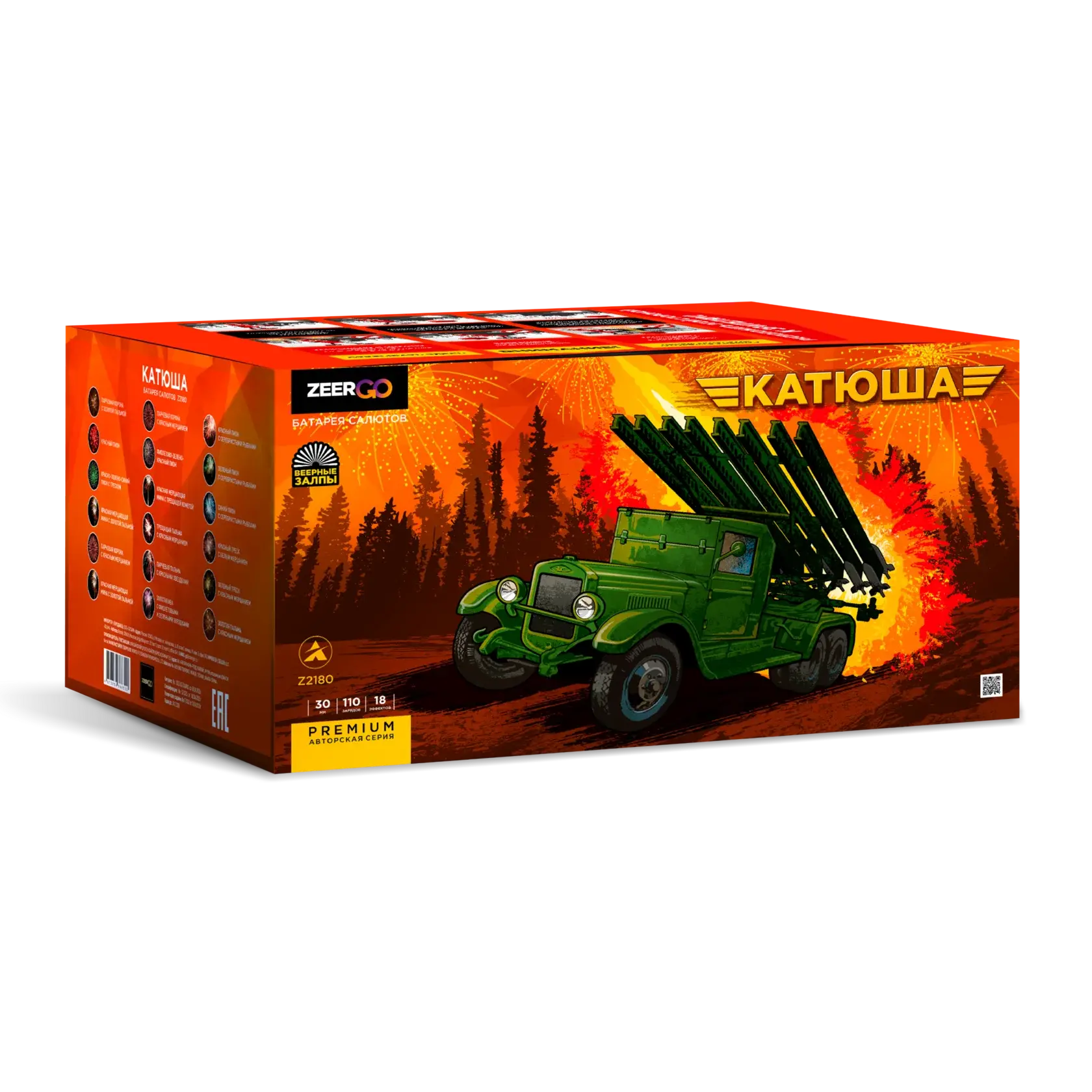 🎉✨ Катюша от бренда ZEERGO — это настоящая феерия огненных узоров! 🌈 ⭐ Представьте себе: яркие вспышки света взлетают вверх на высоту до 30 метров 🚀; эффект «веер» создает невероятную игру цветов вокруг вас ✨; а специальные звуковые трески добавляют атмосферу настоящего праздника 💥! Всего лишь одна батарея подарит вам целых 110 мощных залпов длительностью около минуты (!!!🔥), которые удивят разнообразием из 18 различных визуальных спецэффектов 🤩. Хватит слов – пора устроить незабываемое шоу вместе с батареей "Катюша"! ✨🎇