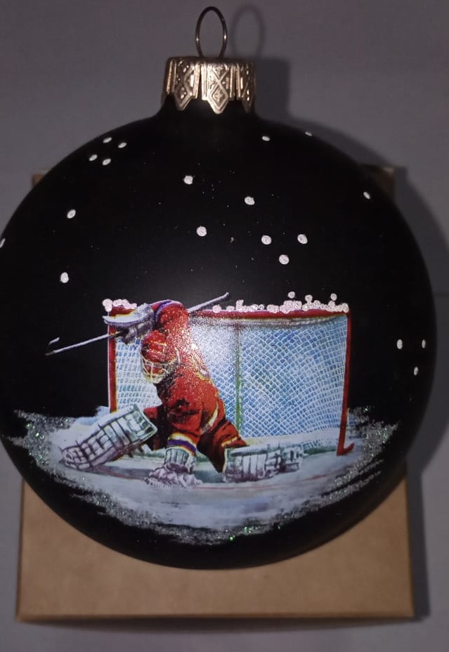 Уникальный подарочный стеклянный ёлочный шарик Хоккейный вратарь с ручной росписью!